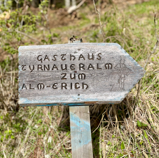 Die Route führt uns zunächst quer zur Lifttrasse der Teichalmlifte, und schon bald begrüßen uns Hinweistafeln mit den magischen Worten „Tyrnaueralm 13” bzw. „Gasthaus Alm-Erich”.