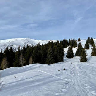 Top motiviert und nach einer kurzen Pause geht´s weiter Richtung Bergstation. Das Lachtal präsentiert sich heute von seiner schönsten Seite ... blauer Himmel, windstill und Schnee... soweit das Auge reicht. Über den Plateau-Weg ziehen wir unsere Spuren in den Schnee, wir passieren die beiden Liftstationen und erfreuen uns am 360° Panoramablick. Einmal halten wir noch kurz inne und atmen die frische Bergluft ein, bevor es parallel zur Piste wieder ins Tal geht.